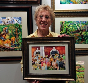 Linda with painting, "The Reunion" at the Kodner Gallery of Fine Art